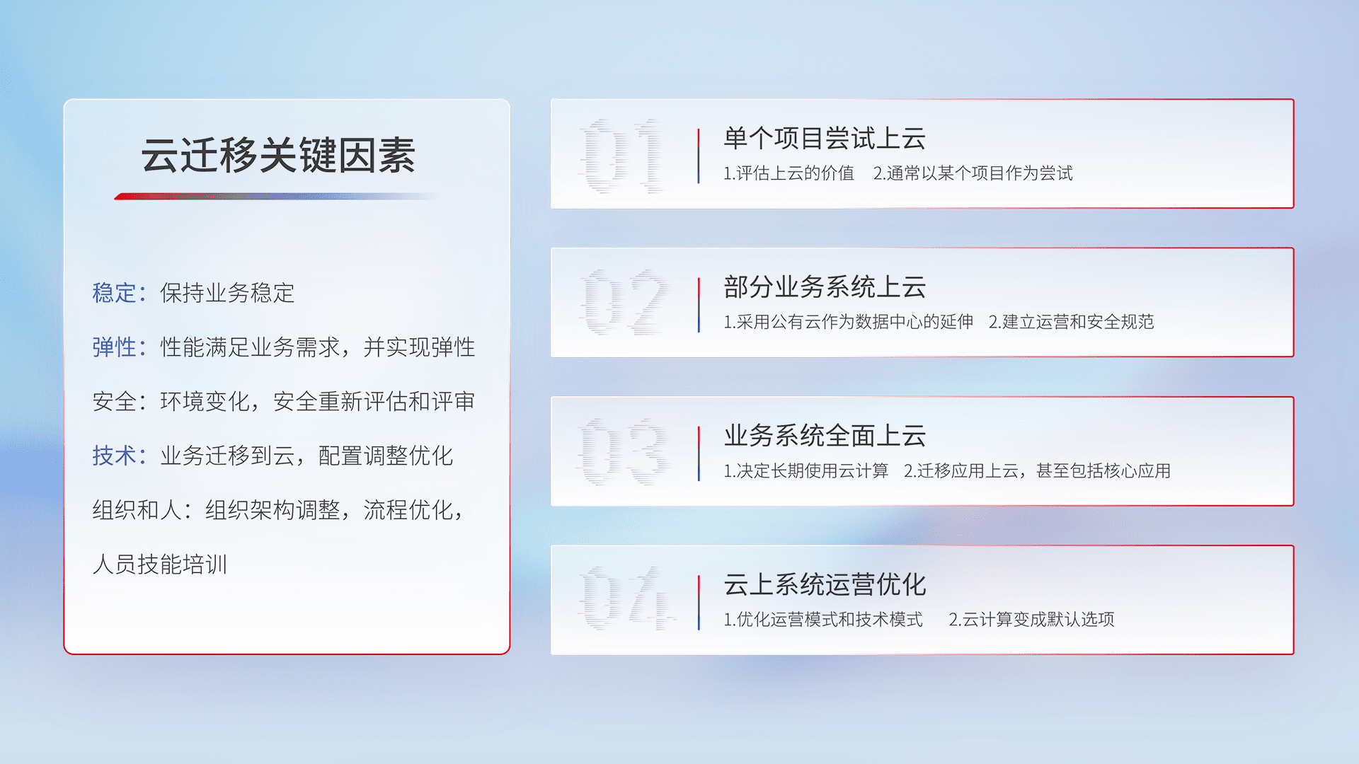 结合实际业务,,,,从规划设计、、、云平台选型、、、云原生改造、、、、数据迁移、、、集成交付,,,迁移全过程为客户识别最佳上云路径,,,,做好风险识别管理,,,,设计网络架构、、、、身份权限、、、、安全审计合规、、、、操作审计、、、、日志审计、、监控告警策略、、多站点容灾设计等,,对云上基础设施进行整体规划,,,提升IT治理水平,,以满足弹性、、高可用、、、高性能的需求。。